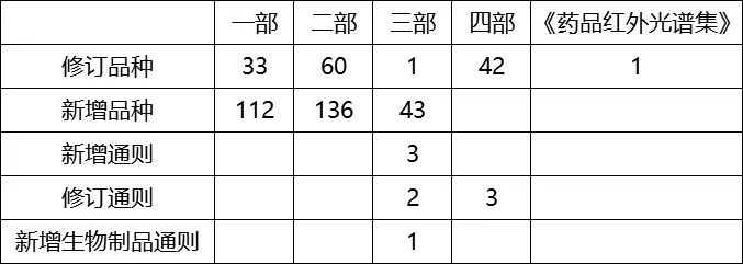 一部新增品種33個,修訂品種112個;二部新增品種60個,修訂品種136個;三部新增生物制品通則1個,新增品種1個,修訂品種43個,新增通則3個,修訂通則2個;四部修訂通則3個,修訂品種42個;《藥品紅外光譜集》(第五卷)修訂品種1個。